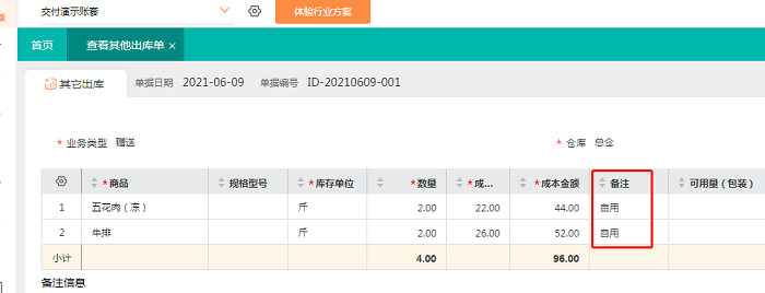 业务类型【赠送】——前文记录,因自用、意外或其他方式耗损的商品出库数据;