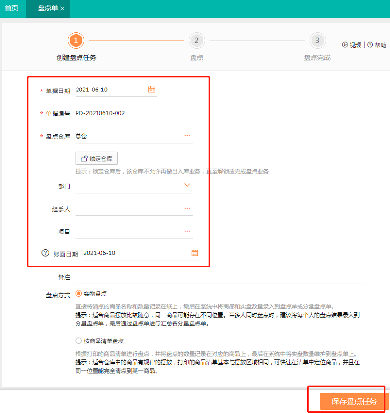 1、库存管理-盘点单,创建盘点任务,并填写盘点日期、仓库、库存账面日期;