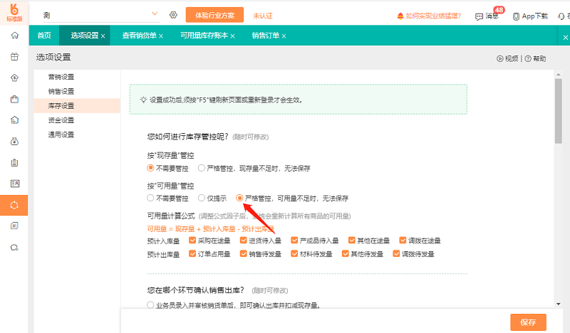 注:参与“可用量计算公式”的业务单据,保存后便会导致商品【可用量】减少,严格管控设置中,单据均无法保存。