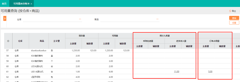 【库存管理】-【可用量库存账本】,可查询各仓库+商品的现存量、可用量、预计入库量、预计出库量各项数值