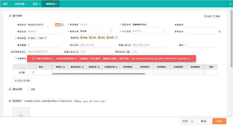 这个提示是因为有特殊字符导致,一般是因为通过扫商品条码自动带出了商品的信息,一般是备注信息里面带有特殊字符,比如下图中的<>号,可以去检查下把特殊的字符删除掉。
