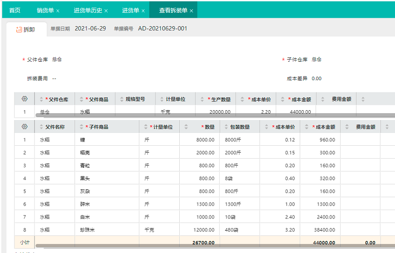 子件-大米、糠、稻谷等副产品,录入加工数量及成本单价。