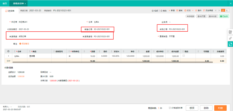 通过进货单表头的销售订单、采购订单号,可以追踪到具体的销售合同和采购合同。