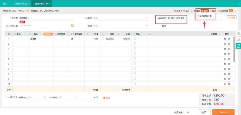1、 客户下单填写销售订单,根据签订的销售合同,进行采购进货,采购订单上选择具体的销售订单(合同):