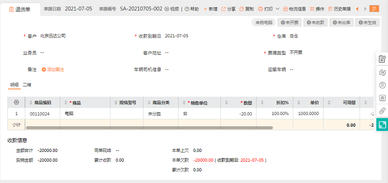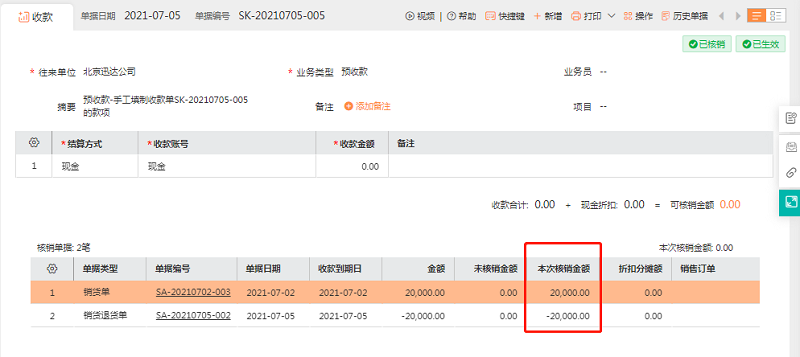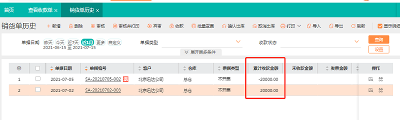 1、销货单【历史】中,并且进入销货单历史查看这两个单据累计收款金额一个是20000,一个是-20000。