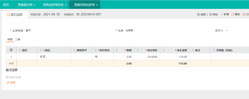 输入当前商品库存,若盘点数量为0,根据盘亏数量自动生成其他出库单调整账面数量