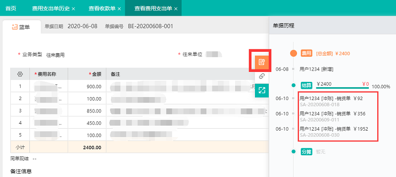 1、在费用单的单据历程中,逐一的点击【查看】联查核销关联单据冲账的销货单。