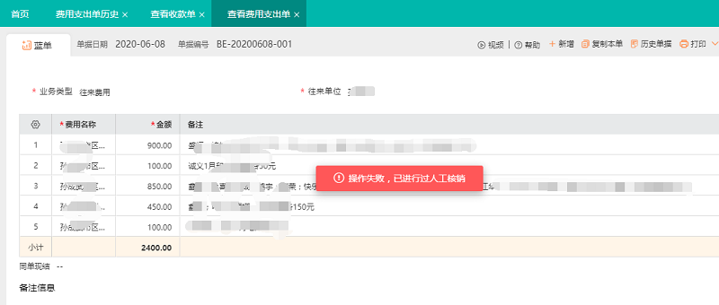 费用单在进行删除时提示:操作失败,已进行过人工核销