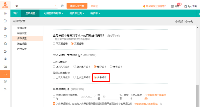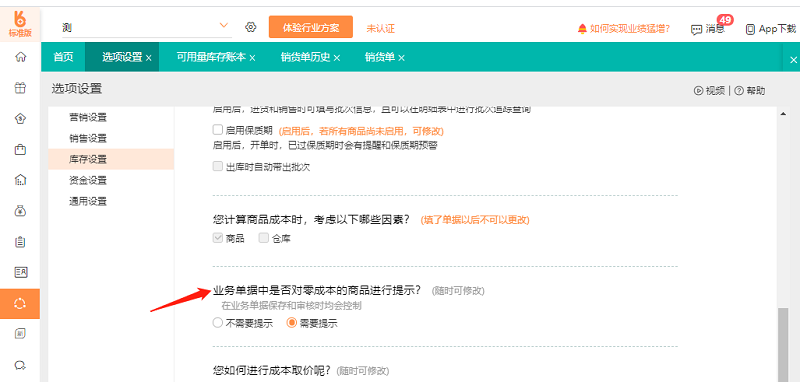 3、开启了商品零成本出库的提示。