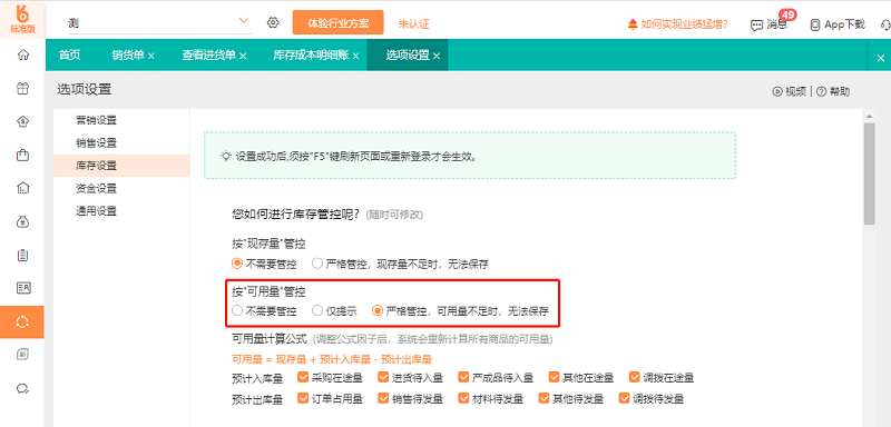 方案3:在【系统设置】-【选项设置】-【库存设置】,启用商品现存量的严格管控;