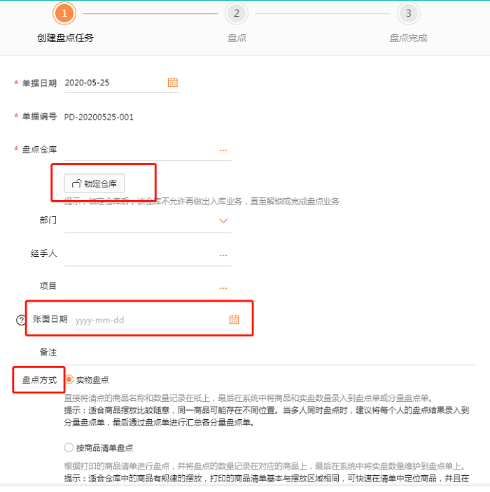 盘点任务中输入盘点仓库、账面日期、选择盘点方式后点击【保存盘点任务】;