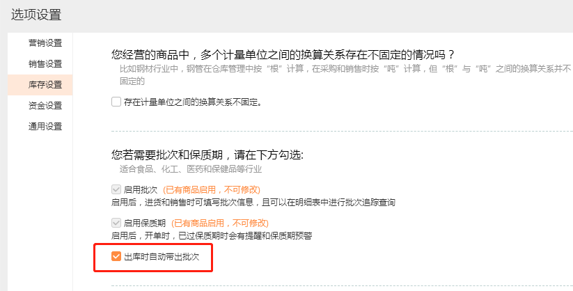 【系统管理】-【选项设置】-【库存设置】中的【出库时自动带出批次】功能;