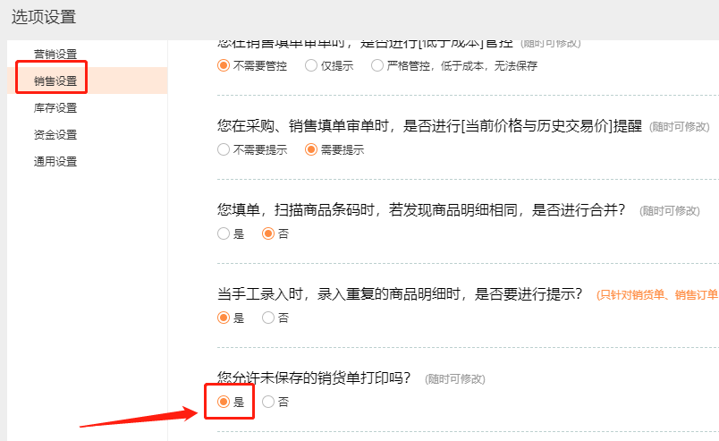 找到【您允许未保存的销货单打印吗?】勾选【是】按钮。