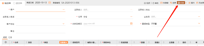 右上角的【打印】按钮是黑色,可实现未保存的销货单也可以直接打印。