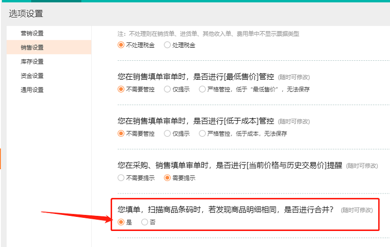 找到【您填单,扫描商品条码时,若发现商品明细相同,是否进行合并?】,勾选【是】按钮;