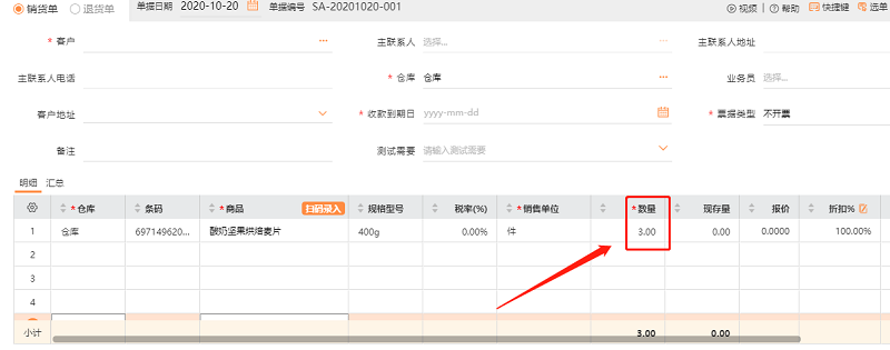 点击表体的【扫码录入】,用条码枪扫描同一商品时,数量自动叠加;