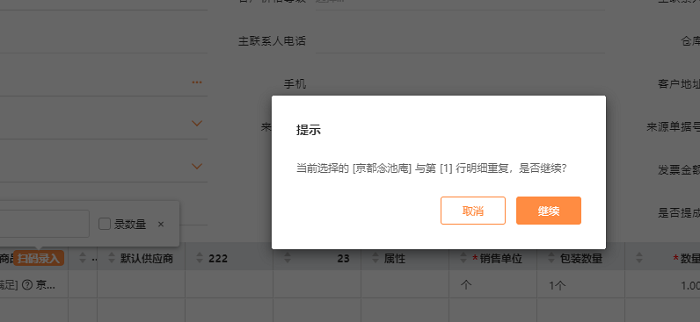 开单扫同一商品会提示“当前X商品与前面第N行商品明细重复,是否继续”;点击【继续】,单据表体会出现2条相同的商品明细。