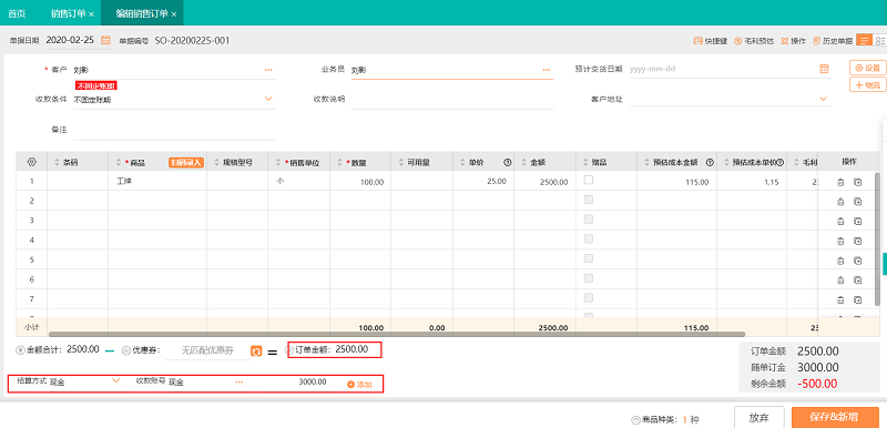 1、与客户签订销售合同,工牌100个,一共2500元,客户直接付款3000元,剩余500留作下次抵用,录入销售订单,表尾填写收款金额3000元: