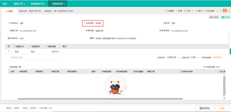 2、软件自动生成3000元预收账款,可以用于后续核销: