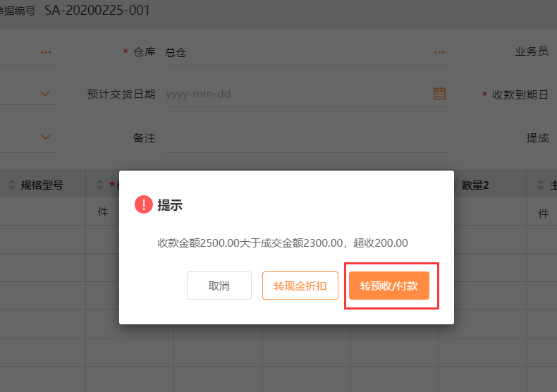1、销售给某客户工作服10件,销售金额共2300元,现客户总共支付2500元,多余的200元作为预收账款,录入销货单和收款金额,保存的时候给出提示,选择【转预收/付款】: