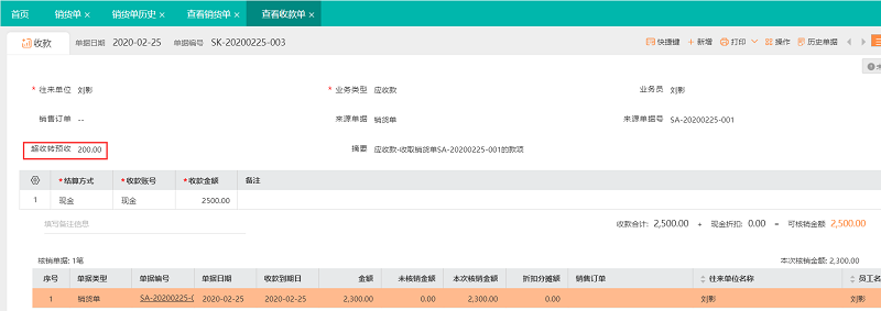 2、单据保存后软件会自动生成收款单,并且表头字段有【超收转预收】200元,多出的金额可以用于后续核销: