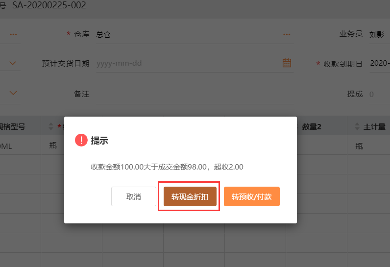 1、销售客户某件商品98元,客户直接付款100元并且表示不需要找零也不作为下次预收,录入销货单和收款金额,保存时给出提示,选择【转现金折扣】: