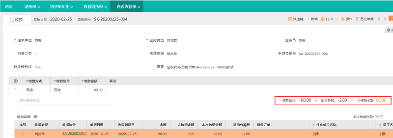 2、单据保存后自动生成收款单,多出2元为现金折扣: