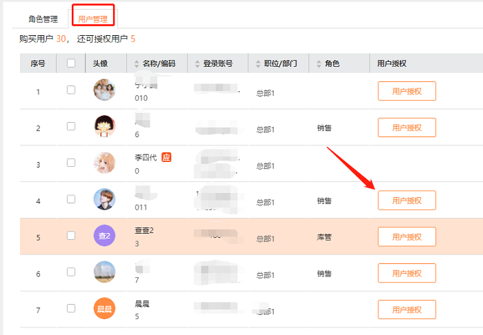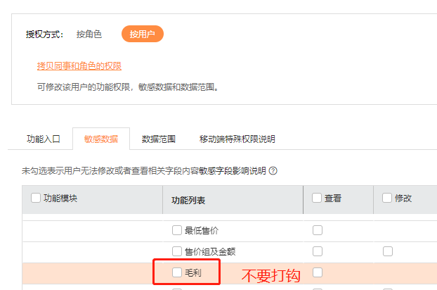 1、电脑端登录好生意,进入【系统管理】-【权限设置】,点击左上角【用户管理】,找到需要设置的员工,点击后面的【用户授权】-【敏感数据】,找到【毛利】字段不要勾选,如下图: