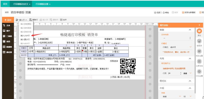 在打印模板中设置小计行,目前打印模板中必须按照小计行,累计行,合计行的顺序来排序设置,具体操作如下: