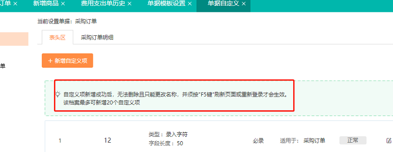 自定义项新增成功后,无法删除且只能更改名称(数值的自定义项不支持),并须按"F5键"刷新页面或重新登录才会生效。