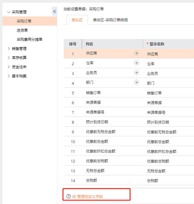 单据自定义设置入口:系统管理【单据模板设置】-“管理自定义字段”