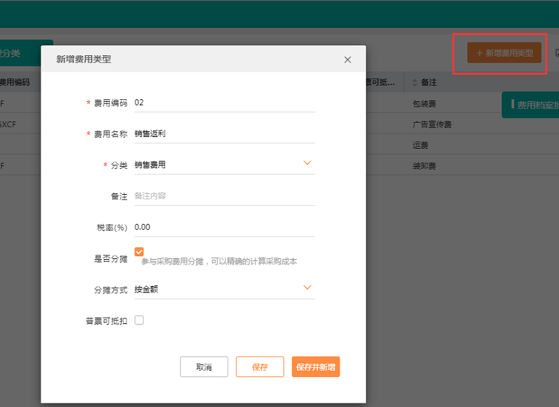 (1) 点击【基础设置】-【费用类型】,在销售费用中新增一个档案为【销售返利】。