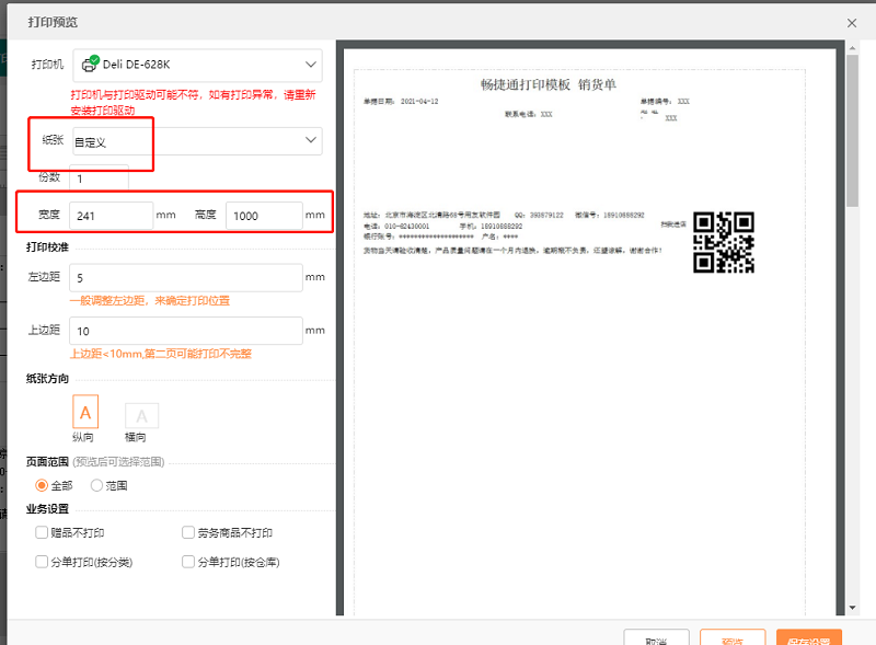 3、最后点击右上角的【预览】,纸张设置成【自定义】,宽设置实际纸张的宽度,长设置1000左右即可。