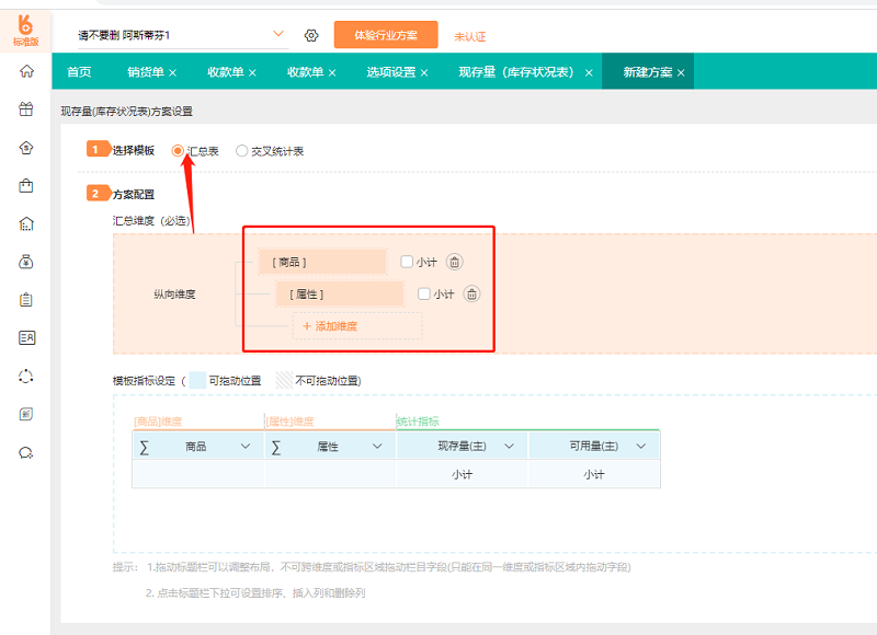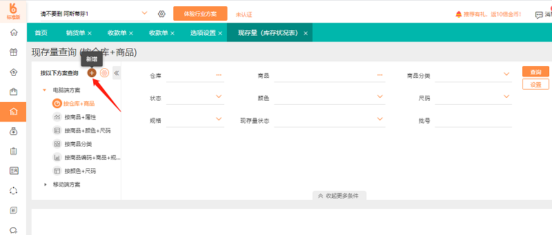 1、账套启用了商品属性后,进入现存量(库存状况表)中,点击左上角的新增查询方案。