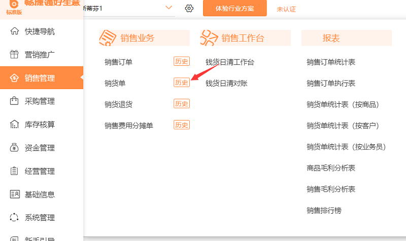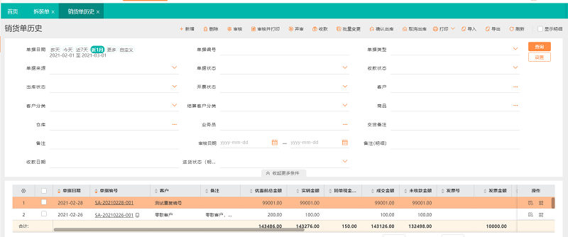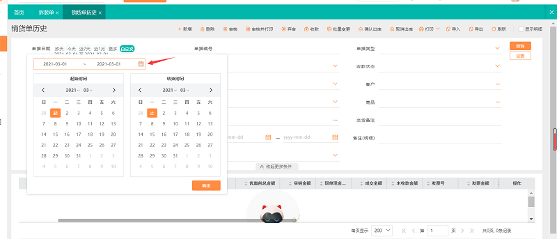 1.依次点击【销售管理】-【销货单历史】,在左上角选择时间区间自定义,选择需要查看单据的时间区间,右侧也可以根据单据的相关属性筛选查询。