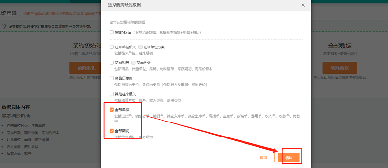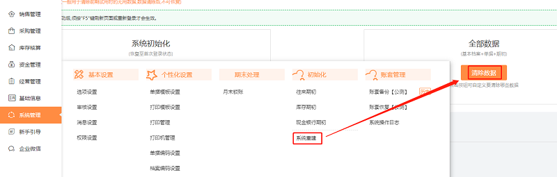 1.管理员账号或者有系统重建权限的账号登入,点击【系统管理】-【系统重建】,点击【全部数据】下面的【清除数据】,输入密码,勾选【全部单据】和【全部期初】,点击【清除】。