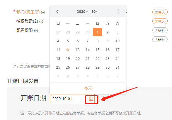 直接点击【新手引导】-【初始设置】,做下角点击【开账时间】的小日历修改成自己需要的日期,然后鼠标点击一下其他地方即可。