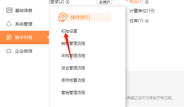 2.点击【新手引导】-【初始设置】,做下角点击【开账时间】的小日历修改成自己需要的日期,然后鼠标点击一下其他地方即可。