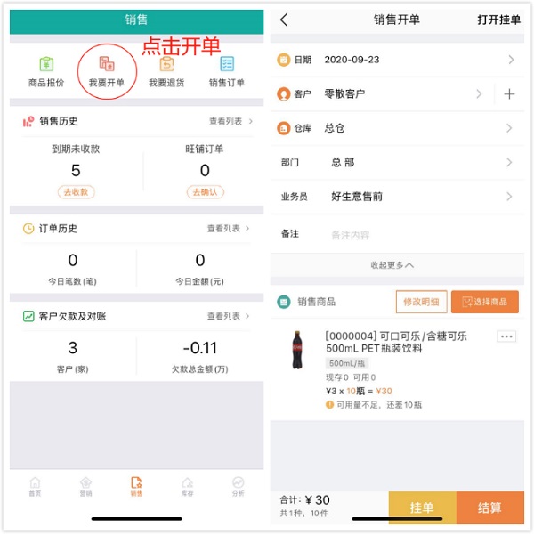 01客户要货,打开手机,一键开单安装好生意app,打开手机销货开单,依次填写客户、商品、数量等销售信息,保存,销货单就开单完毕啦。
