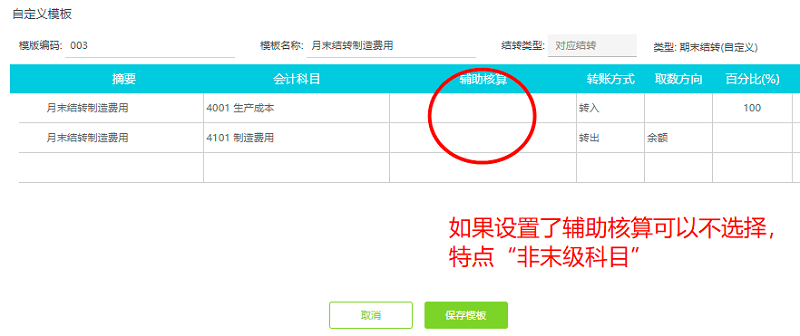 备注:公式结转重点可以理解为:需先想好此结转模板的具体分录是什么→然后对此分录中每个科目取数的设置(通过编辑公式来设置),并且如果按公式结转设置只能选择末级科目,不能选择非末级科目,例如:制造费用各明细结转至生产成本-辅助生产车间中核算。