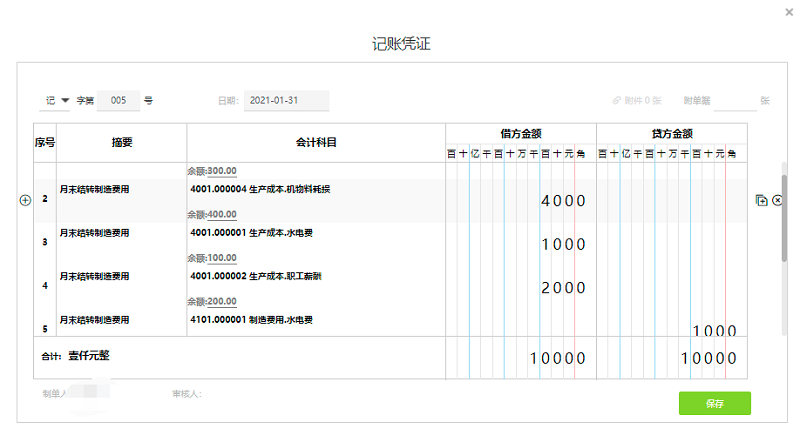 1、某企业于2021年1月已经做完日常制造费用发生的凭证,由记账凭证自动生成明细账数据如下: