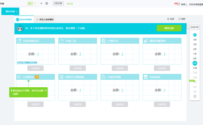 在这个易代账秘籍中,只要点击【测算金额】,自动计算本期月末结转金额,生成或查看凭证可确定业务是否完成,一个界面搞定每月月末结转,快速没有遗漏;