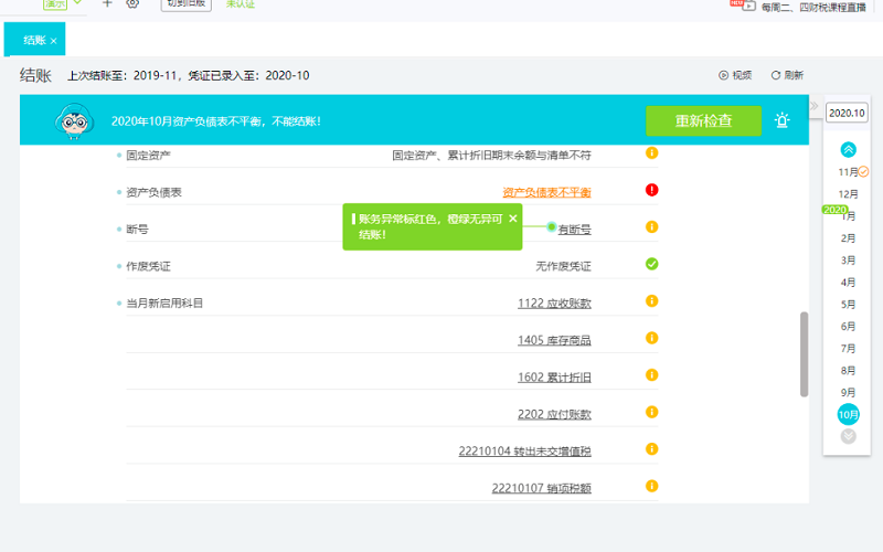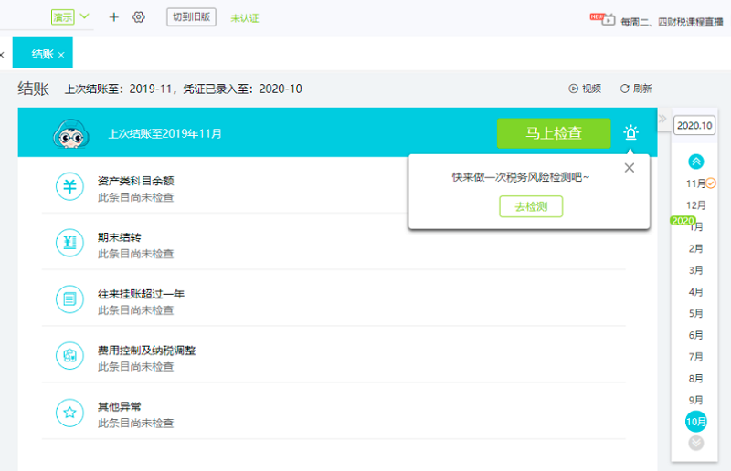 通过易代账【马上检查】,一键查看系统设定的5大类检查项:资产类、期末结转、往来款项挂账情况、费用控制纳税调整、其他异常。