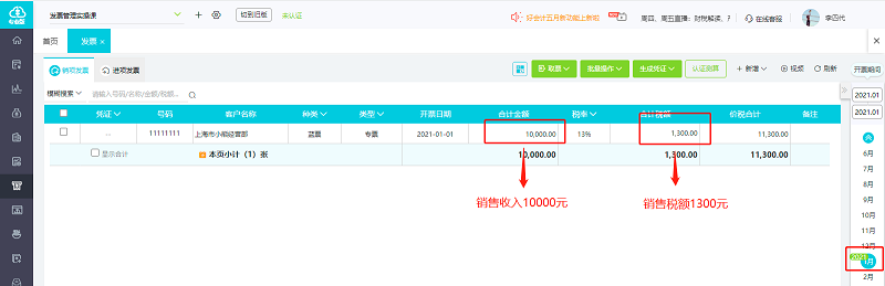 1、点击【发票管理】-【发票】,可以查看A企业2021年1月销售发票数据如下: