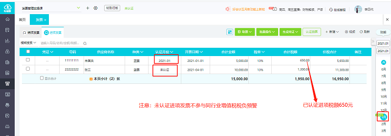 2、点击【发票管理】-【发票】,可以查看A企业2021年1月进项发票数据如下: