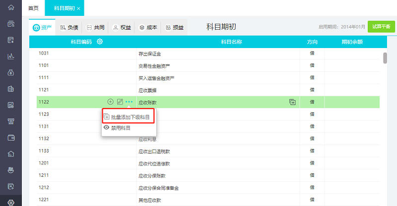 以 “应收账款”为例,可以按照以下流程批量添加明细科目