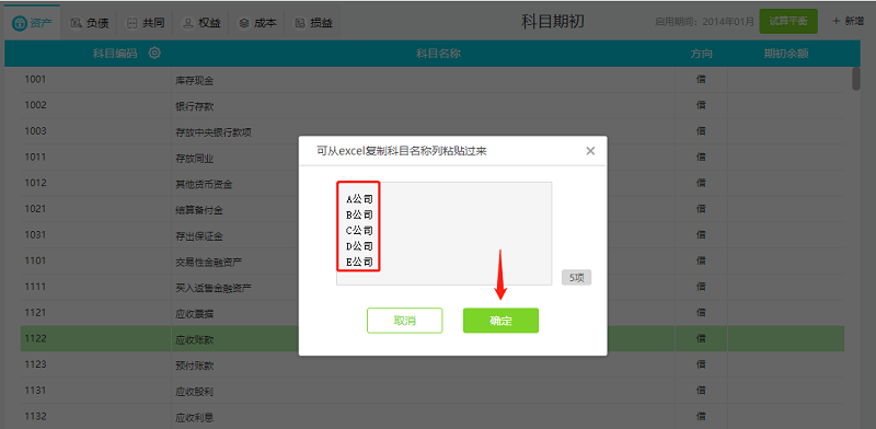 直接将明细科目以竖着排列的方式,全部复制粘贴过来(科目少也可以手工输入),点击右下角确定,我们可以看到所有的明细科目就一次性添加好了。