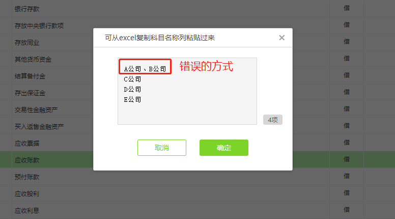 ※ 特别注意,科目复制粘贴的时候,一定不能将多个明细科目填在同一行,因为在同一行的会视同为一个会计科目去添加。