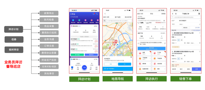 业务人员每天按照日程安排(工作计划、任务等),到达终端网点现场,签到后,执行拜访,完成促销执行、竞品采集、销量上报、库存上报、巡店(陈列检查、费用执行)、终端资产投放管理等事项,并填写拜访总结,最后完成拜访并签退。标准化任务清单,高效便捷操作。