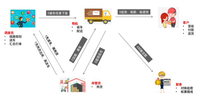 订单到仓库后,仓管人员按派车情况或线路集中拣货,司机在发货区根据任务装车,按照线路派送,派送结束后,回到公司对账交款,并再次装车配送。订单实时,仓储及时响应提升订单量,加强终端开发和管控,让一条配送线路有更多的客户,订单充足,减少空跑;高效拣货配送,提高客户满意度,让订单更多。